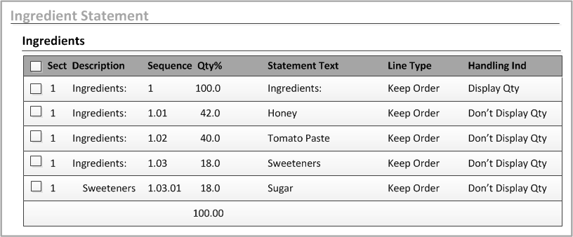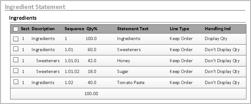 Tomato PasteandSweeteners. This was due to the recalculation of the Qty % column values. Originally,Sweetenershad a Qty % value of 60, but with the promotion of theHoneyingredient, theSweetenersQty % value is now 18.