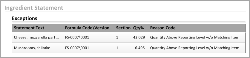 The Exceptions tab in the Ingredient Statement form is ideal for helping you to identify discrepancies between formulas.