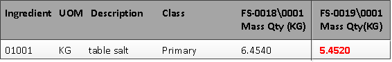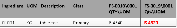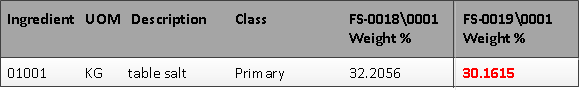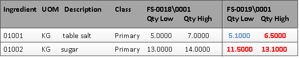 (For Ingredients in Formula to Formula Comparison or Formula to Specification Comparison)