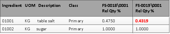 | Relative Quantity % | If the items on a formula have relative quantities defined, the Rel Qty % values are shown in the Compare results. The Rel Qty % values are retrieved from the fsformulaingred table. ![]() |