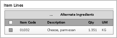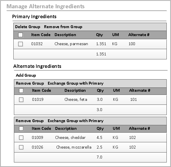 - Notice the item, 01032, displays as the Primary Ingredient. In this example, there are two groups of alternates: one with a single cheese (101), the other with 2 cheeses (102).