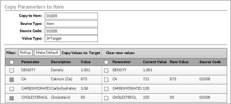 Shows the parameter values of the source object in the target object column. The parameter values from the Source grid are copied to the Target grid by the system. The parameter values are copied to the New Value column in the parameter’s Base UOM.