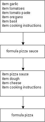 A formula is composed of ingredients, quantities, and instructions. In this example, the pizza sauce formula is composed of five items and a cooking instruction. Pizza sauce is also a sub-formula in the pizza formula.