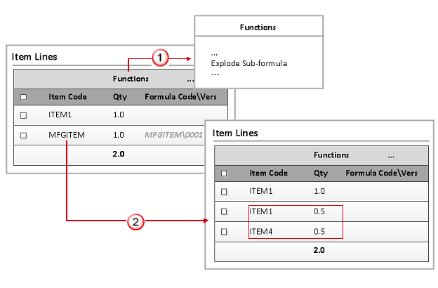Formulas that are indirectly nested can also be exploded. In this example, a manufacturing item, MFGITEM, has been exploded.
