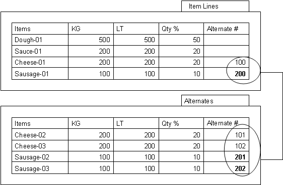 Here, you are replacing CHEESE_01 with CHEESE_02 and CHEESE_03. SAUSAGE_01 is being replaced with SAUSAGE_02 and SAUSAGE_03. Alternate numbers are assigned by Optiva.