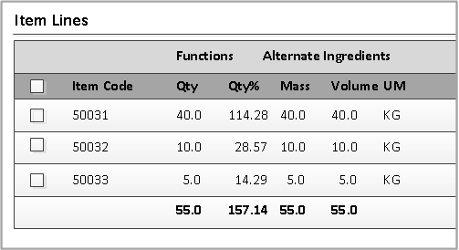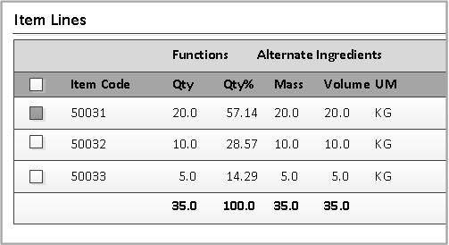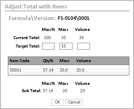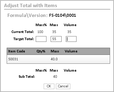 In the Formula form, add or subtract quantities from one or more items that are based on a formula total. The formula total is specified in the Adjust Total with Items dialog.