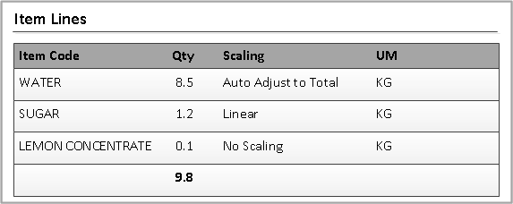 If you know that you always want to have ten liters total of lemonade, you can use water as the quantity sufficient ingredient. The formula’s parameters are calculated based upon the ten liter yield.