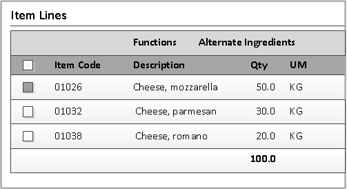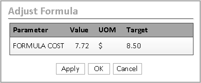 A formula contains three types of cheeses: mozzarella, parmesan, and romano. You can select mozzarella cheese and adjust the target value for the FORMULA COST parameter. Then, mozzarella cheese item is adjusted to meet the new parameter target value.