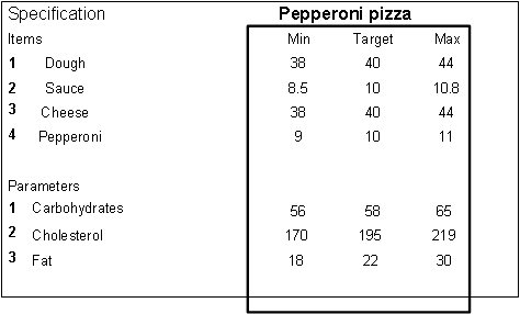In this example, the Optiva Specification is used as a prototype for Pepperoni Pizza formulas. The acceptable ranges for both the pizza ingredients and parameters are defined here.