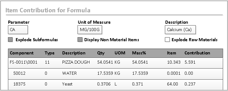 Examining item contributions for a single parameter To view item contributions for a single parameter, complete these steps: Open the Formula form. Click the Parameters tab. Select the parameter for which you want to view item contributions. Click Show Item Contributions. In this example, sub-formula FS-0011\0001 represents 5.591 percent of the Calcium parameter value in the parent formula. The check boxes are described briefly here. Explode Subformulas Select this check box to show the value of the sub-items in relation to the sub-formula. Display Non-Material Select this check box to show the items that do not contribute to parameter values, such as packaging. Explode Raw Materials Select this check box to show the constituents of raw materials. Note: Contribution for byproducts are highlighted in red.