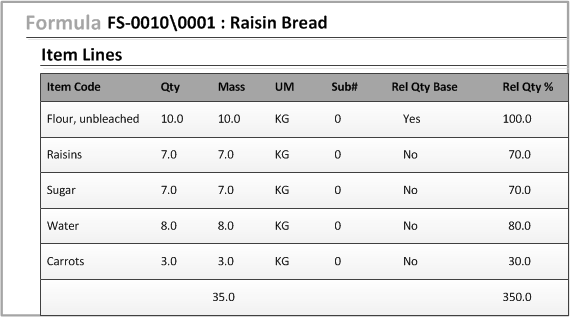 - If a formula does not have a base ingredient, then the Rel Qty % value for each ingredient is zero.
