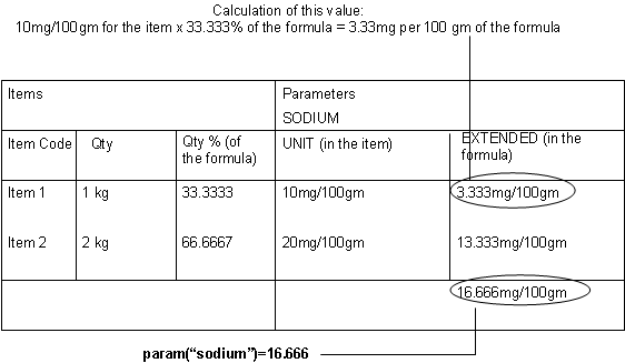 Use Tparam to return the net contribution of a formula’s parameter (i.e., the actual value). This value is based on the percentage or concentration of the parameter and the formula’s mass. If the total concentration of the parameter for all items is 16.666MG/100GM and the total quantity for the items is 3KG (3000GM), Tparam returns 499.98. The calculation is 16.666MG/100GM X 3000GM = 499.98.