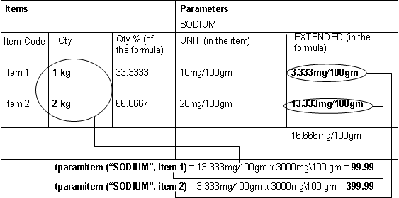 Returns the net contribution of an item parameter (i.e., the actual value). The value is based on the percentage or concentration of the parameter and the formula mass. Suppose the parameter value for one item is 3.33MG/100GM of the formula and there is 3KG (3000GM) of the item. Then the tparamitem value is 99.9. The calculation is 3.333MG/100GM X 3000MG\100GM = 99.9.