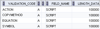 ACTION,COPYMETHOD,EQUATIONorSYMBOL.Update FSVALIDATIONFIELD Set LENGTH_DATA = ### Where VALIDATION_CODE = … And FIELD_NAME = 'SCRIPT'