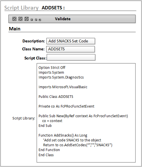 You can use the Script Library form to create a script. After you specify a unique name for the script, the script framework defaults automatically. The Class Name is added to the form by the system. The Class Name is the same as the Script Name.