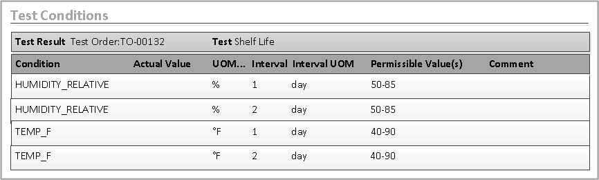 - Click the Test Conditions tab. The conditions are displayed as they were configured on the Conditions tab of the Test form. If there are intervals for the test, they are displayed for the conditions.