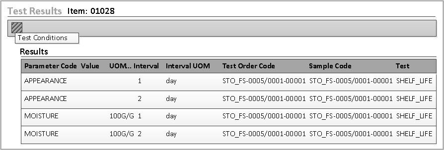 Specify parameter values in the Test Results grid and the Test Conditions grid. The test order and each test within it are added to the report/view of the sample.