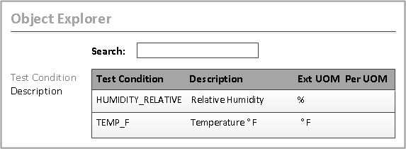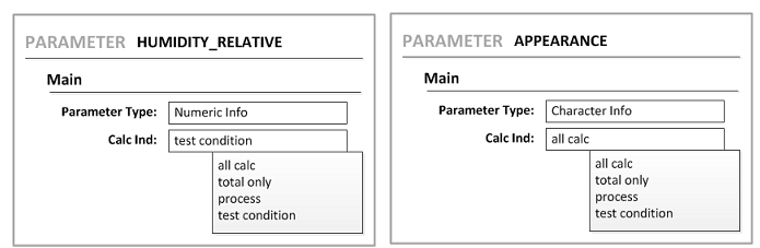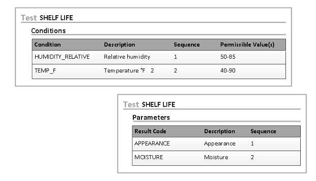 Parameters can be used for test conditions and results. This example shows the conditions for the parameters that are on the Shelf Life test method.