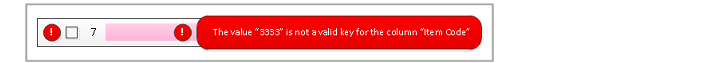 • If an invalid entry is made to a field, the field is highlighted and an exclamation icon is displayed inside the field. The icon is also displayed at the beginning of any rows in error. To see the error message text, hover your mouse over the icons.