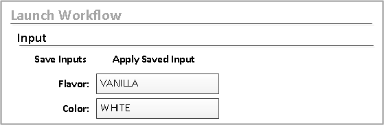 In this example of the Launch Workflow form, color is derived from flavor. Flavor is the primary field. The user specifies the primary values for the object; if there is only one possible value, it is specified automatically.
