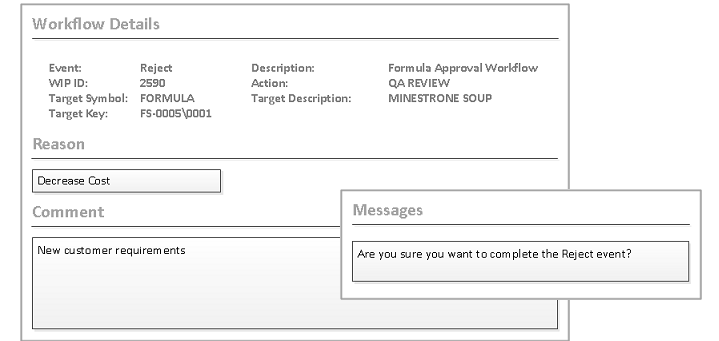 In this example, the user is prompted to confirm the completion of the event. The user has already specified the reason for rejecting the task in the Workflow Details dialog.