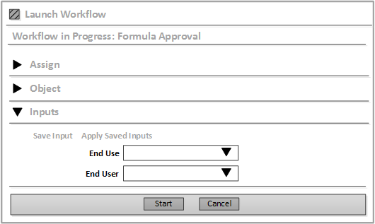 When you click in the Launch Workflow dialog, all of the input values that you previously saved are displayed.