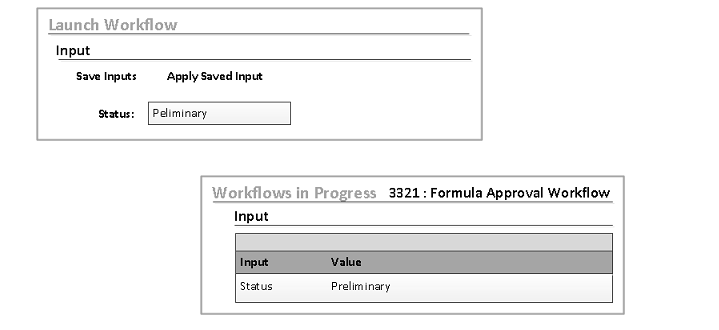 In the Workflows in Progress form, you can view the user inputs. These values were entered by users in the Launch Workflow form.