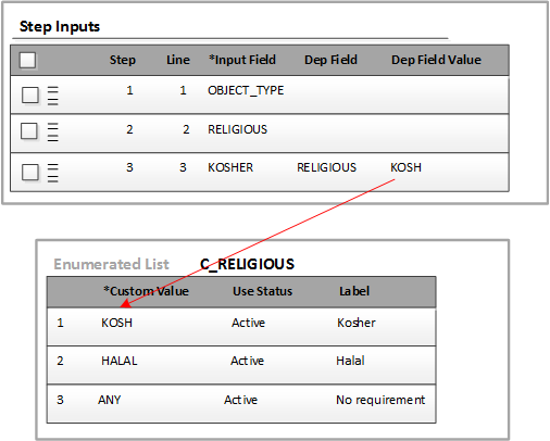 Dep. Field Value is KOSH. This value must correspond to the Value code in the Enumerated List form, not the language code.