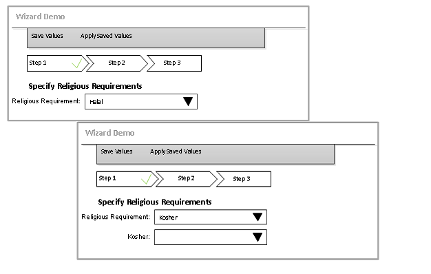 In this example, the Kosher field is shown only when the user selects Kosher from the Religious Requirement drop list.