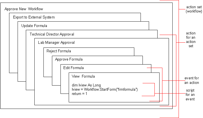 Optiva Workflows are comprised of four components that build upon each other. Scripts define the events that are part of actions. The actions are used to construct the action sets.