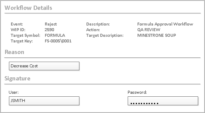 You can specify both Reason and Sign for an event in the Action form. In this case, the user must specify a reason and provide an electronic signature in the Workflow Details dialog.