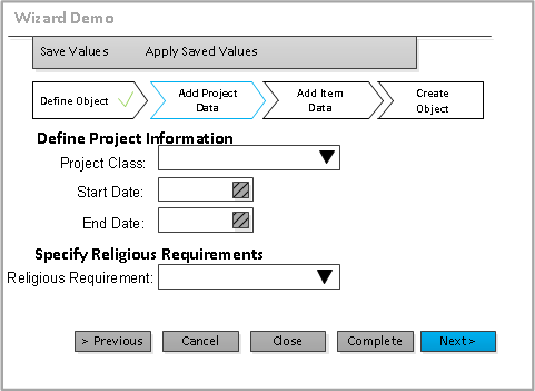 Here is an example of a wizard that has four separate steps. The green check mark indicates that the first step has already been completed. The second step is prompting you to complete project information and to specify religious requirements.