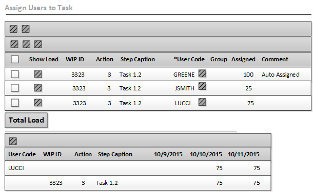 Two users, JSMITH and LUCCI, are added to this task. JSMITH is assigned a load percentage of 25 and LUCCI is assigned a load percentage of 75.