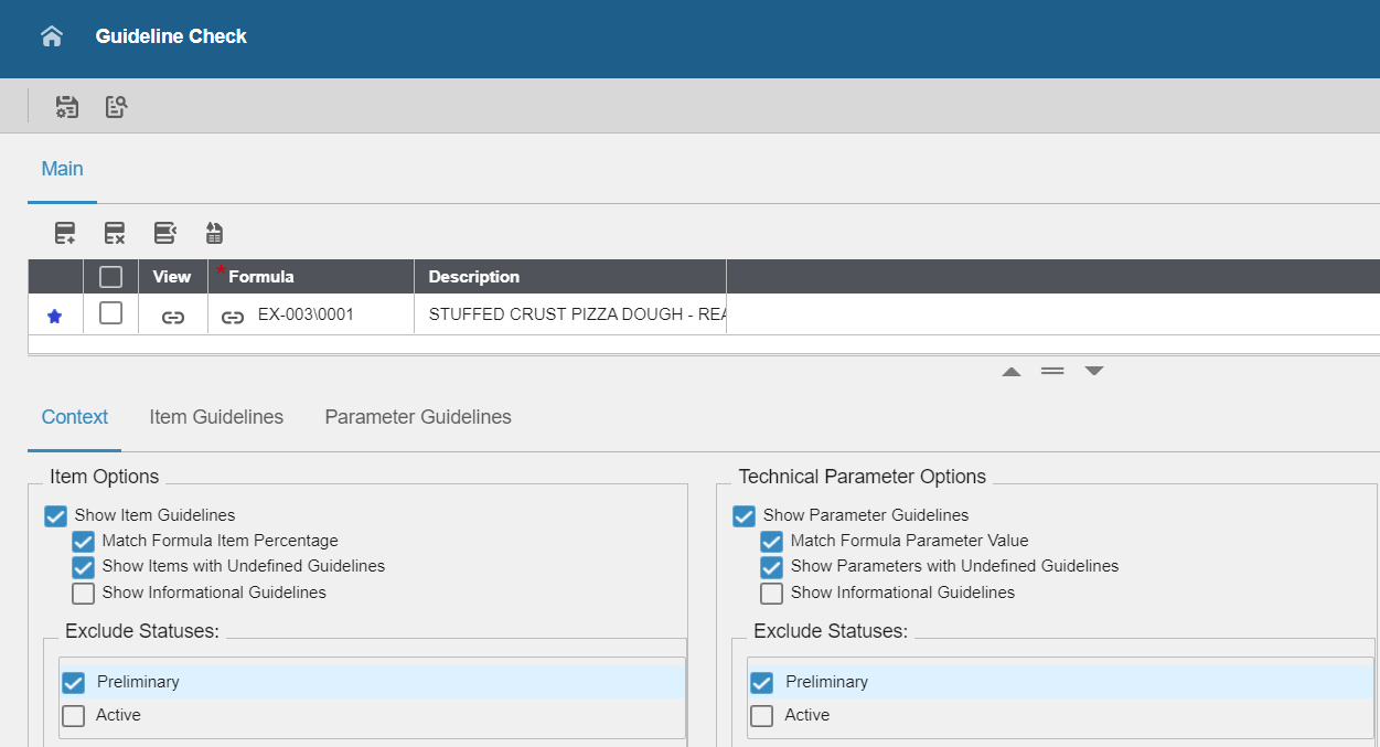 You can exclude Item and Parameter Guidelines from consideration in a Guideline Check with the Exclude Statuses control. This control is in the Context tab of the Guideline Check form. By default, no status codes are excluded from a guideline check.
