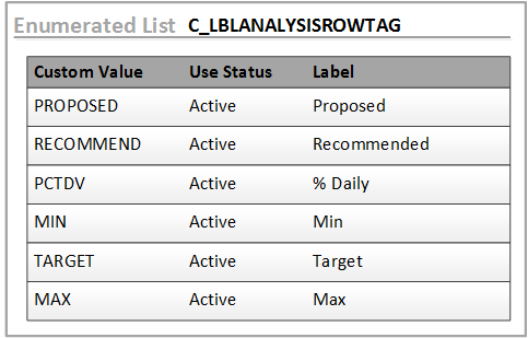 The C_LBLANALYSISROWTAG enumerated list provides the Field column choices that are available for selection in the Claim Definition form.