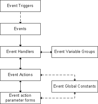 Event Handler Diagram Use this form to present a graphical representation of an application event handler flow. You can also use this form to access the Event Actions form for selected event actions to view or modify them. Finally, you can add event actions to an event handler flow by using this form.