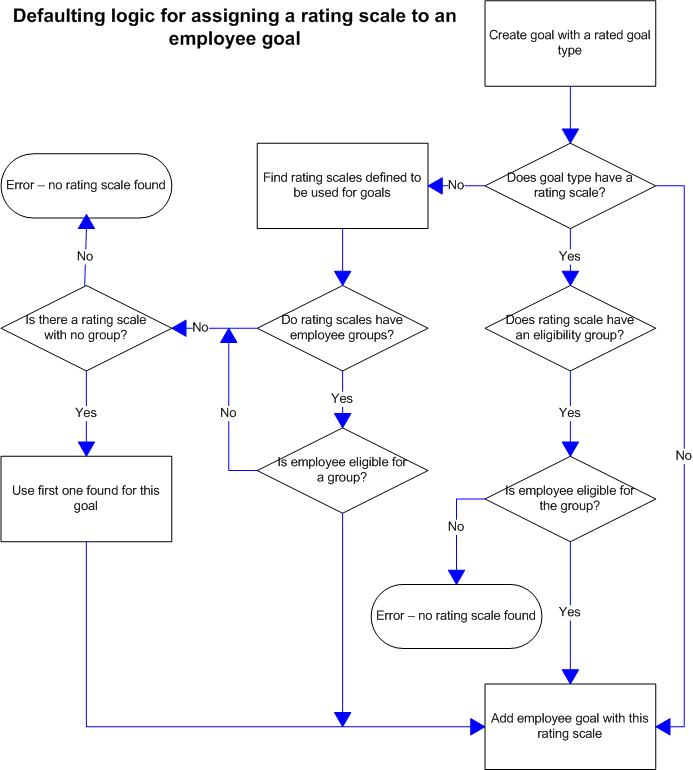 Rating scale defaulting logic on employee goal The following graphic illustrates how the rating scale defaults on an employee goal.