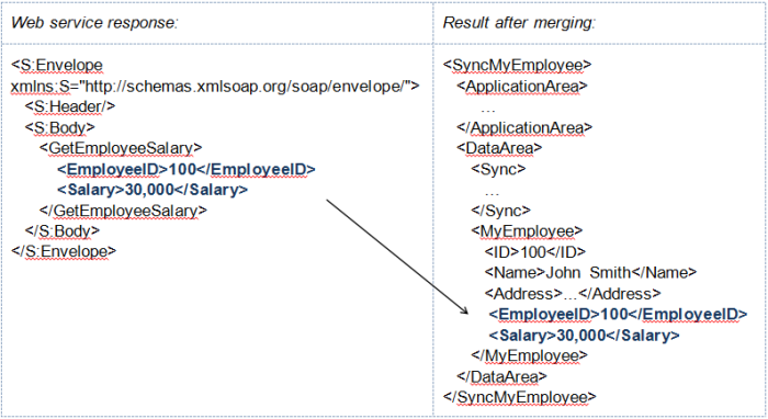 Note: the SOAP envelope and header are not included when merging. In this example an RPC-style web service is used, the children ofGetEmployeeSalaryare included when merging. In case of a document-style web service, the children of the Body element are merged into the BOD.As the last step, a transformation is used to align the BOD to its definition. In this example it means that the irrelevant
