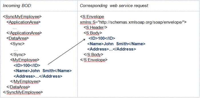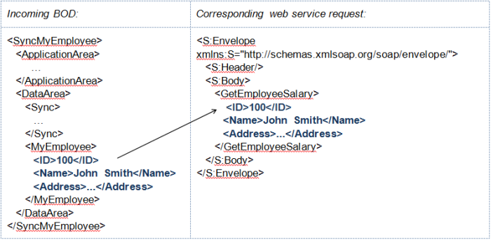 <?xml version="1.0" encoding="UTF-8"?> <xsl:stylesheet version="2.0" xmlns:xsl="http://www.w3.org/1999/XSL/Transform"> <xsl:output method="xml" version="1.0" encoding="UTF-8" indent="yes"/> <!-- change indent to "no" after testing --> <xsl:template match="DataArea"> <S:Envelope xmlns:S="http://schemas.xmlsoap.org/soap/envelope/"> <S:Header/> <S:Body> <GetEmployeeSalary> <EmployeeID><xsl:value-of select="MyEmployee/ID"/></EmployeeID> </GetEmployeeSalary> </S:Body> </S:Envelope> </xsl:template> </xsl:stylesheet>The content from the response is merged into the employee BOD. If the