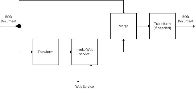 The incoming BOD document is transformed to the input as required for the web service operation. Then the web service is invoked using this input. If the process is successful, the output is merged into the BOD document. If required the resulting merged BOD document is transformed to the final BOD document.