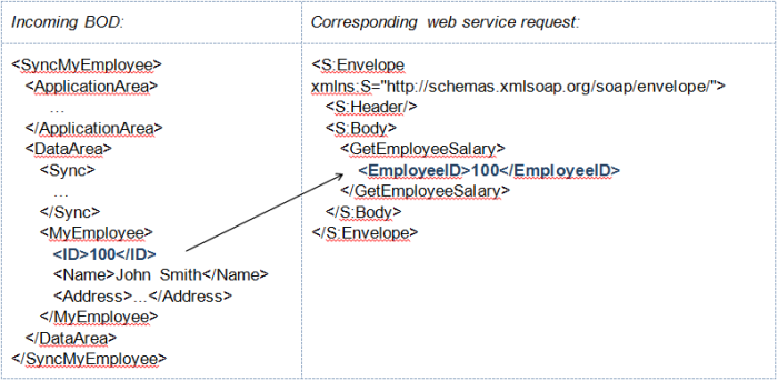 <?xml version="1.0" encoding="UTF-8"?> <xsl:stylesheet version="2.0" xmlns:xsl="http://www.w3.org/1999/XSL/Transform"> <xsl:output method="xml" version="1.0" encoding="UTF-8" indent="yes"/> <!-- change indent to "no" after testing --> <xsl:template match="DataArea"> <S:Envelope xmlns:S="http://schemas.xmlsoap.org/soap/envelope/"> <S:Header/> <S:Body> <GetEmployeeSalary> <EmployeeID><xsl:value-of select="MyEmployee/ID"/></EmployeeID> </GetEmployeeSalary> </S:Body> </S:Envelope> </xsl:template> </xsl:stylesheet>The content from the response is merged into the employee BOD. If the