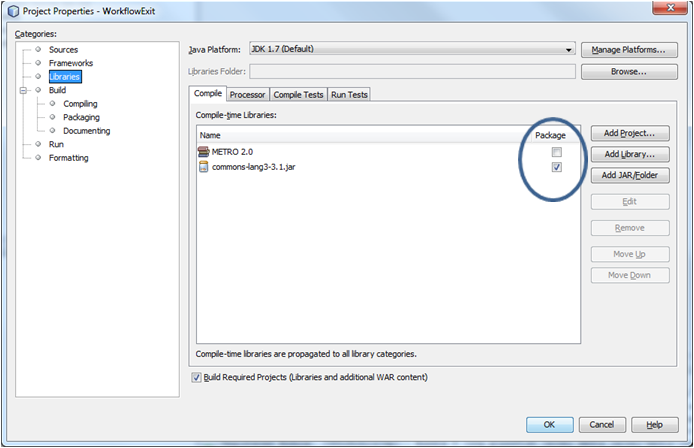 To use the sample project with GlassFish, ensure that the METRO 2.0 check box is cleared in the Compile-time Libraries panel. This figure shows an example: