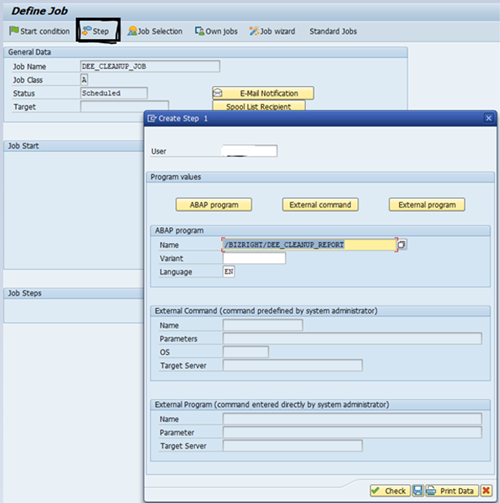 - For the SAP release version NW750 and above, select DEE_CLEANUP_JOB job name and /BIZRIGHT/DEE_CLEANUP_REPORT program.