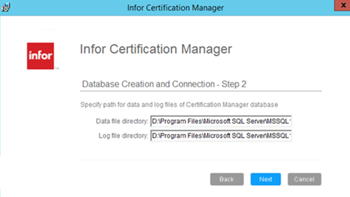 - In the Database Server field, specify the name of the server hosting the Certification Manager database. The Database Name field is populated automatically. Both these fields are editable.