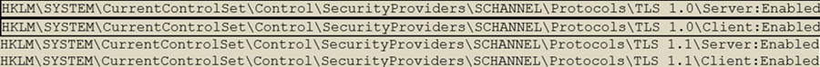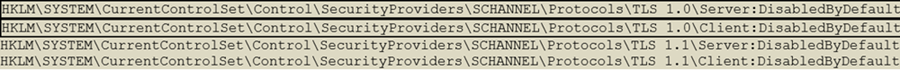 Ensure TLS 1.0 and TLS 1.1 are disabled Perform the following to disable TLS 1.0 and TLS 1.1. Set the following key to 0. Set the following key to 1.