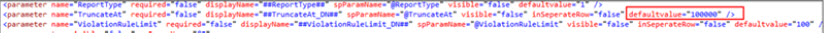 | Node | <parameter name="TruncateAt" required="false" displayName="##TruncateAt_DN##" spParamName="@TruncateAt" visible="false" inSeperateRow="false" defaultvalue="100000" /> |