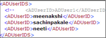 To allow access to specific Active Directory users, enter the user login name details in theADUsers.xmlfile. During user mapping, users are picked up from the ADUsers.xml. Only the users specified in this xml file will be mapped.