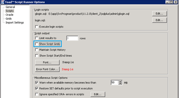 - Click Scripts in the left hand panel of the screen and clear the Show Script Grids checkbox as shown below.