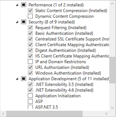 Install the following minimum web server components on the application server for IIS 10x:
