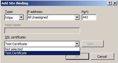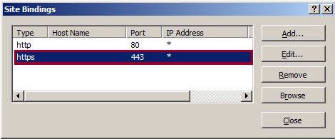 - The default settings for a new binding are set to HTTP on port 80. Select https in Type.